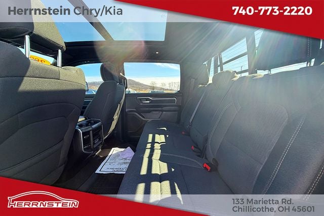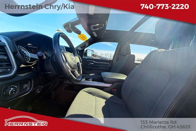 Herrnstein Auto Group is very proud to offer this 2021 Ram 1500 Big Horn/Lone Star in Diamond Black with Black Cloth. This 1500 is very well equipped with 1 Owner, Accident Free History Report, Alloy Wheels, XM/Sirius Satellite Radio, iPod / USB Port, Auxiliary Audio Port, Backup Camera, Touchscreen Control Center, Bluetooth®, Voice Recognition, Apple CarPlay, Trailer Tow Package, Remote Start, Heated Steering Wheel, Heated Seats, Running Boards, Lane Keeping Assist, and Blind Spot Monitor Big Horn Level 2 Equipment Group (115V Auxiliary Power Outlet, 115V Auxiliary Rear Power Outlet, 2nd Row In Floor Storage Bins, 400W Inverter, Air Conditioning ATC w/Dual Zone Control, Auto-Dimming Exterior Driver Mirror, Auto-Dimming Rear-View Mirror, Black Premium Power Mirrors, Class IV Receiver Hitch, Cluster 7.0 TFT Color Display, Exterior Mirrors Courtesy Lamps, Exterior Mirrors w/Supplemental Signals, Foam Bottle Insert (Door Trim Panel), For More Info, Call 800-643-2112, Glove Box Lamp, Heated Front Seats, Heated Steering Wheel, Media Hub w/2 Charge Only USBs, ParkSense Front/Rear Park Assist w/Stop, Power 4-Way Driver Lumbar Adjust, Power 8-Way Driver Seat, Power Adjustable Pedals, Power-Folding Mirrors, Rear Dome w/On/Off Switch Lamp, Rear Power Sliding Window, Rear Window Defroster, Security Alarm, SiriusXM Radio Service, Sun Visors w/Illuminated Vanity Mirrors, and Universal Garage Door Opener), Premium Lighting Group (Front LED Fog Lamps, LED Reflector Headlamps, and LED Taillamps), Quick Order Package 25Z Big Horn (Big Horn Badge), Trailer Tow Group (Add Class IV Receiver Hitch, Trailer Brake Control, Trailer Light Check, Trailer Reverse Steering Control, and Trailer Tire Pressure Monitoring System), 180 Amp Alternator, 3 Rear Seat Head Restraints, 3.21 Rear Axle Ratio, 4 Way Front Headrests, 4-Wheel Disc Brakes, 40/20/40 Split Bench Seat, 48V Belt Starter Generator, 6 Speakers, 8.4 Touchscreen Display, 9 Amplified Speakers w/Subwoofer, ABS brakes, Active Noise Control System, Air Conditioning, Alloy wheels, AM/FM radio, Apple CarPlay, Big Horn IP Badge, Black Exterior Mirrors, Black Trailer Tow Power Mirrors, Blind Spot & Cross Path Detection, Brake assist, Bucket Seats, Bumpers: chrome, Cloth Bench Seat, Compass, Delay-off headlights, Deluxe Cloth Bucket Seats, Dome Dual LED Reading Lamp, Driver door bin, Dual front impact airbags, Dual front side impact airbags, Dual Rear Exhaust w/Bright Tips, Dual-Pane Panoramic Sunroof, Electronic Stability Control, Exterior Mirrors w/Heating Element, Front anti-roll bar, Front Center Armrest w/Storage, Front fog lights, Front reading lights, Front Seat Back Map Pockets, Front wheel independent suspension, Full Length Floor Console, Fully automatic headlights, Google Android Auto, GPS Antenna Input, Heated door mirrors, Heavy-Duty Engine Cooling, HEMI Badge, Illuminated entry, Integrated Center Stack Radio, Integrated Voice Command w/Bluetooth®, Leather steering wheel, Low tire pressure warning, Occupant sensing airbag, Outsi